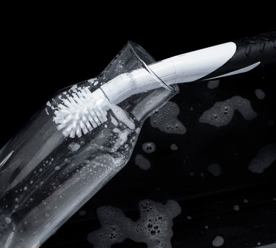 Angewinkelt um in und um Gläser, Flaschen und mehr zu reinigen. Viele Borsten erleichtern die Arbeit.